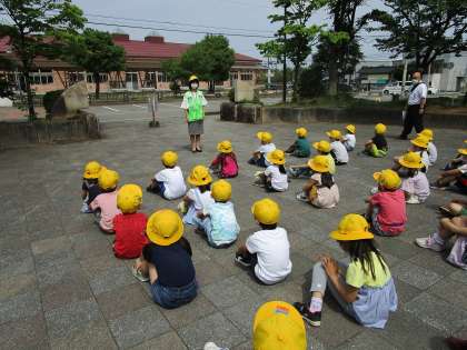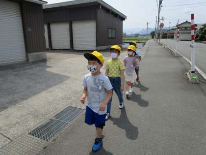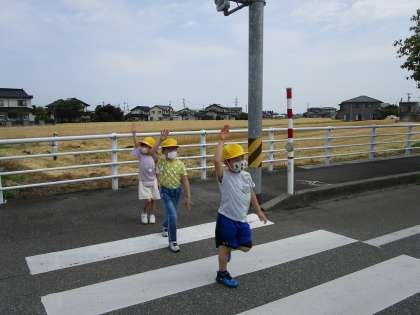 黄色コースの子供たちは、間隔をあけて1列歩行を意識して歩き、車通りの多い道路も周りの安全に気を付けながら渡ることができました。また、信号のない道路でも一人一人が一旦停止をし、左右確認してから渡ることの大切さを学ぶことができました。