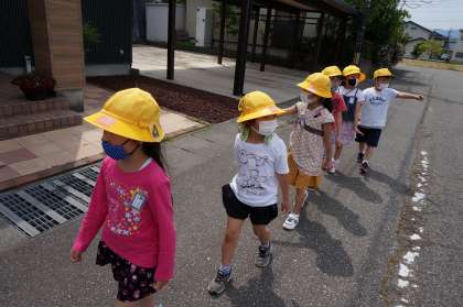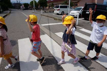 交差点では、足を止めて、右・左・右と確認し、手を挙げて道を渡りました。また、歩きながら、用水などの危険なところを確認したり、車の音が聞こえたら気を付けたりする姿が見られました。
