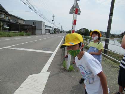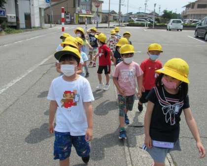 水色コースは人数が多く歩きづらいところもありましたが、一人一人が左右確認をし、車が来ないか確かめて横断していました。また、高い段差のある道や田んぼの近くを歩く際には、ふらふらしないようにしっかり前を向いて歩く大切さに気が付いていました。