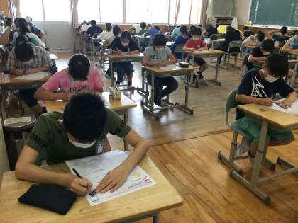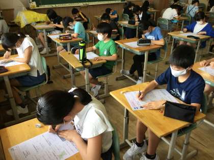 6年生 6/5(金) シーン・・・ 公開日 2020/06/05 更新日 2020/06/05 6年生 静かな教室で、算数「対称な図形」のテストをしています。線対称な図形や点対称な図形を作図する問題では、描き方を思い出しながら、丁寧に取り組んでいます。