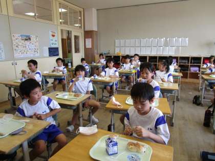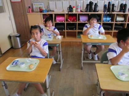 6月10日(水) 3年生 給食 公開日 2020/06/10 更新日 2020/06/10 3年生 久しぶりの給食です。子どもたちは蒸しパンに「美味しい」と声を上げたり、初めての魚肉ソーセージの包装に開け方に苦戦したりするなど、楽しくすごしました。