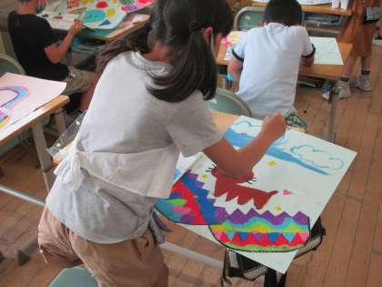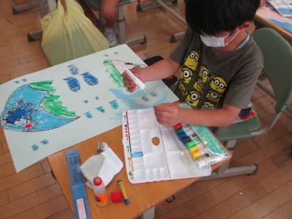 2年生 図工「ひみつのたまご」 公開日 2020/06/11 更新日 2020/06/11 2年生 図工の学習で、「不思議なたまご」から生まれる話を想像して、絵を描きました!たまごの割り方や想像した話をクレヨンや絵の具を使って、表現しました。完成が楽しみです!