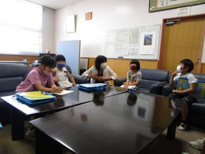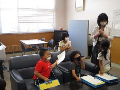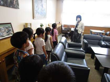 今日は、とても楽しみにしていた校長室へ。初めて入った校長室には、いろいろなものが置いてあって、興味津々。校長先生にインタビューし、校長先生のことをたくさん知ることができました。教室に戻ると、「なかよしになれたよ〜!」と喜ぶ子供たちでした。