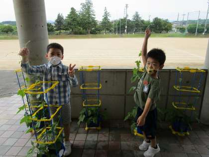 アサガオのつるがぐんぐん伸びています。つぼみを見つけて喜ぶ子供たちの姿も見られます。