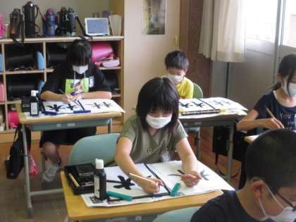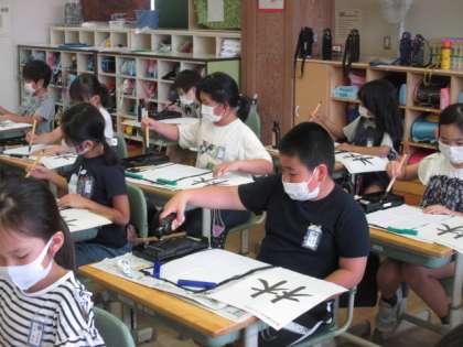 書写では「林」の練習をしています。 2つの木のバランスが難しく、お手本を見ながらじっくり丁寧に書いていました。
