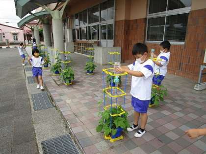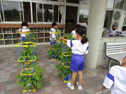 アサガオのつるが、自分の身長よりも高く伸びている子供が増えてきました。今朝、花が咲いていた子もいて、みんな大興奮!「これがつぼみかなあ?」と、アサガオのお世話をしながら観察し、花が咲くのを心待ちにしています。