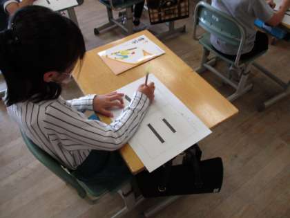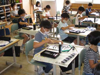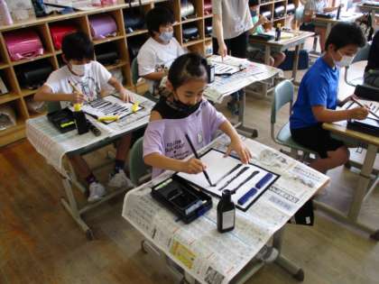 3年生 はじめての毛筆(竹) 公開日 2020/06/22 更新日 2020/06/22 3年生 初めて毛筆の学習を行いました。まず、毛筆で書かれた字とパソコンで書かれた字を比べ、毛筆習字の書き方の特徴を考えました。その後、習字の準備をしました。お手本を道具の並べ方をしっかり確認し、いよいよ書き始めです。どれくらい筆に墨を付けたらよいか、いろいろ試しながら楽しんで挑戦しました。