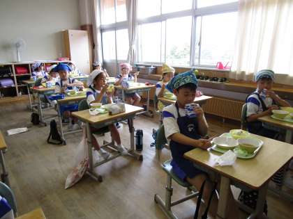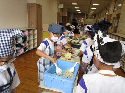 3年生 久しぶりの給食! 公開日 2020/06/22 更新日 2020/06/22 3年生 今日は2ヶ月ぶりの通常給食。(品数は減っていますが) 子どもたちは給食をとても楽しみにしていました。全員がエプロン、三角巾をつけ、衛生に気を付けながら、テキパキ準備しました。久しぶりの給食メニューに子どもたちは顔をほころばせていました。