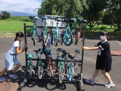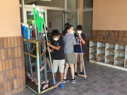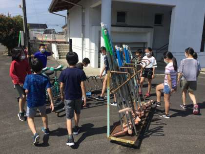 委員会の時間に、一輪車と竹馬の準備をしました。全校のみんなが使いやすいよう、協力して取り組んでいました。