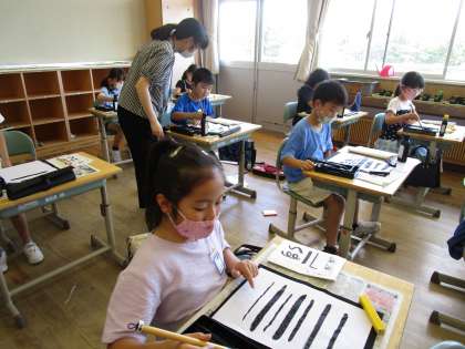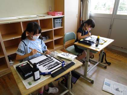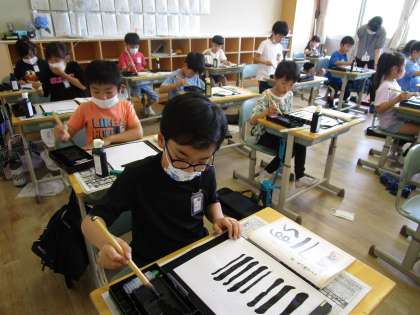 3年生 初めての習字(松) 公開日 2020/06/23 更新日 2020/06/23 3年生 初めての毛筆習字に挑戦しました。子どもたちは新しく使う道具にどきどきわくわくしながら、力の入れ方や筆の持ち方などに気を付けて字を書くことができました。