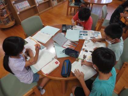 前回の授業で、地球環境が危ないことを知った子供たち。今日は、図書室の本で環境問題について調べ学習です。