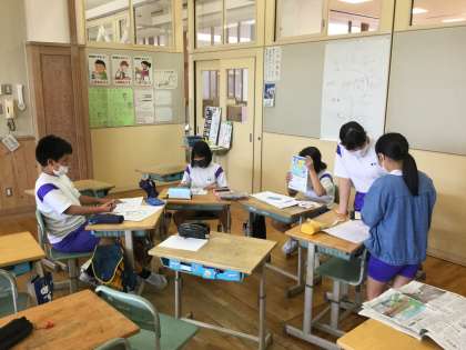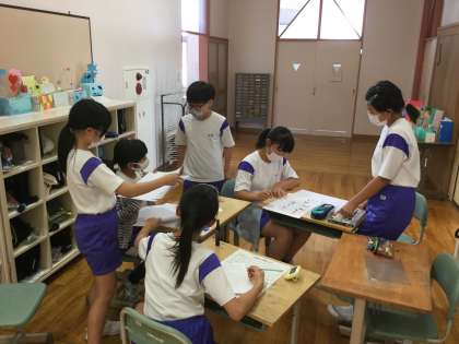 1年生との交流に向けて、グループごとに準備中。グループの仲間と協力して、案を出したり道具を作ったりしています。