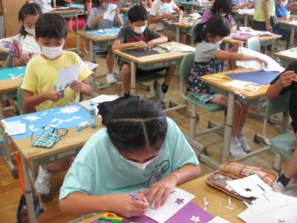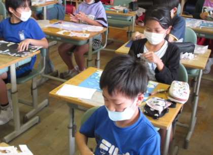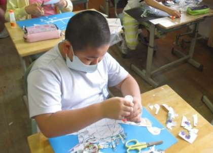 自分たちが作った模様を切り貼りし、作品を作っていきます。 個性あふれる楽しい作品ができあがりました!