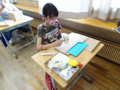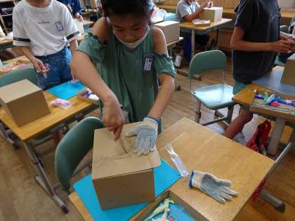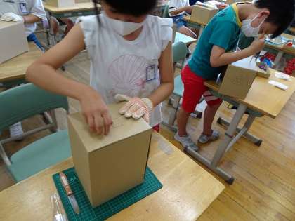 段ボールカッターで、箱に窓を作ったり、好きな形に切ったりしました。
