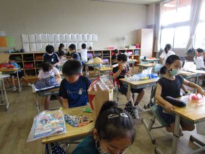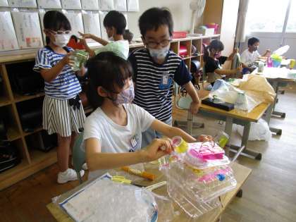 図工の学習で、プラスチックでできた透明な箱やペットボトルなどを使い、いろいろな作品を作りました。大きな動物や電車など、想像した物を表現しようと一生懸命取り組みました。