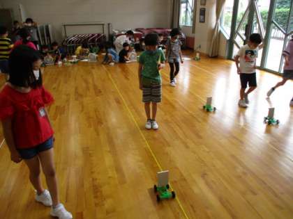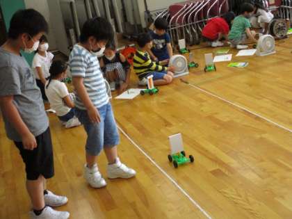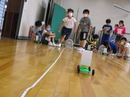 理科の学習で風を受けて走る車を使い、風の強さによって進む距離が変わるか実験をしました。子どもたちは、「もっと遠くまで走れ」と声をかけながら実験に取り組んでいました。
