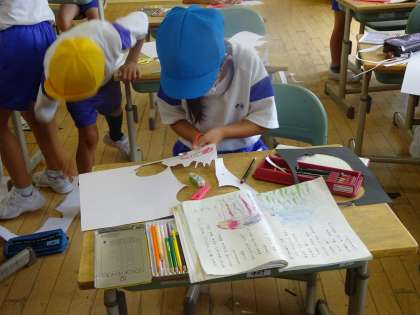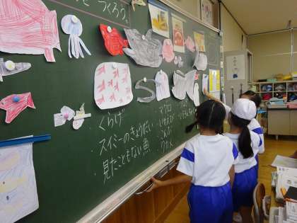 スイミーの世界を想像して、生き物の絵を描きました。子どもたちは、スイミーになりきり、生き生きと活動しました。