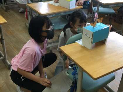 図画工作の時間に作った作品を見合っています。友達が作った作品を見たり動かしたりして、「なるほど!」「この動き、おもしろい」等と、作品のよさを見付けていました。