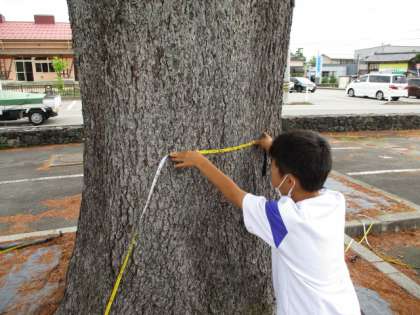 算数の学習では、巻き尺を使って長さ調べをしました。子どもたちは、杉の木や学校の柱などの周りの長さを測るときは、巻き尺が便利であることを実感していました。