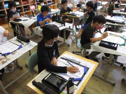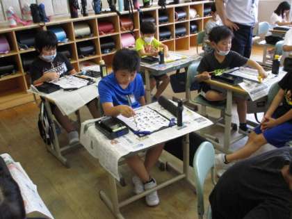 3年生 毛筆で名前書き 公開日 2020/07/03 更新日 2020/07/03 3年生 書写の学習では、初めて小筆を使って名前を書く練習を行いました。習った小筆の持ち方や書くポイントについて気を付けながら、自分の名前のお手本をよく見て書くことができました。