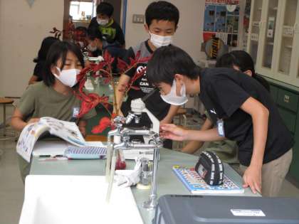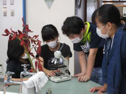理科の観察中。 班で協力して顕微鏡で植物を観察しました。