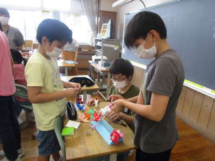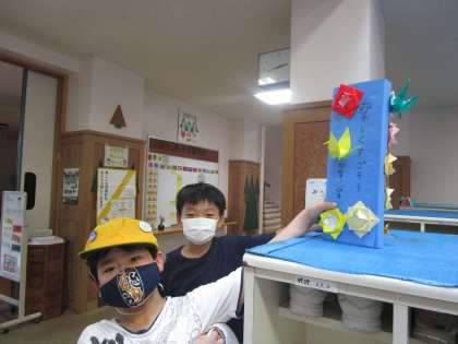 環境美化委員会では、学校の環境を美しくしたいと考え、各学年の下足入れのところに、折り紙で作った飾りを掲示しました。みんなが喜んでくれるとうれしいなあ!
