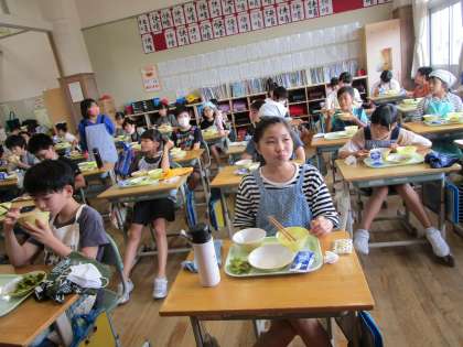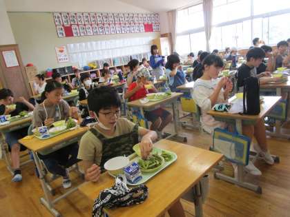 全員前を向き、静かに給食。 今日のメニュー「枝豆」の皮をむき、黙々と食べています。