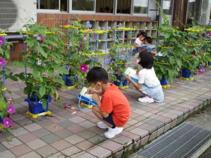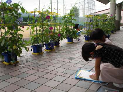 アサガオの花が咲き始めたので、花やつるの様子をじっくり観察しました。「花の内側は星みたいな模様だよ。」「ピンクと水色の花が咲いているね。」と友達と嬉しそうに交流する姿が見られました。