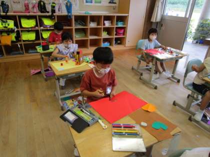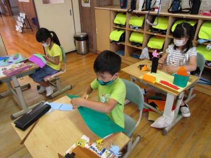 1年生 図工「おってたてたら」 公開日 2020/07/09 更新日 2020/07/09 1年生 先週に引き続き、「おってたてたら」の学習を進めました。大きなビルや木を作ったり、小さな虫や魚を作ったりして、それぞれの素敵な町が出来上がりました。