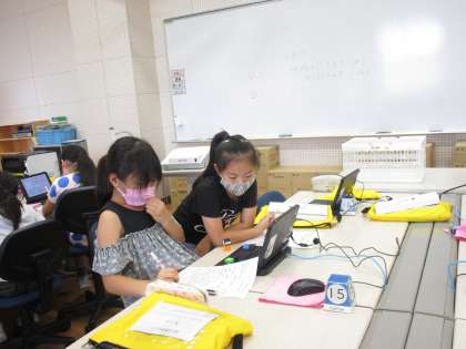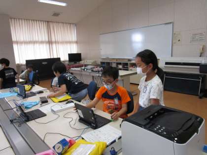 総合的な学習の時間では、子どもたちがそれぞれ作ったプログラムを友達に紹介しました。誰が、どんなときに使うと便利なのか、自分の思いを伝えながらプログラムを動かして演示していました。