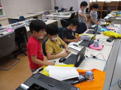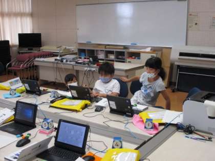 総合的な学習の時間では、作ったプログラムを友達に発表しました。友達の思いや考えを聞き、「ぼくも同じようなプログラムを作ってみたいな」と感想を抱く子どももいました。