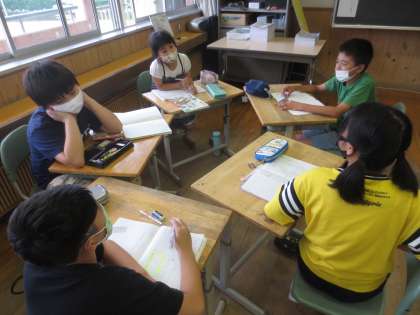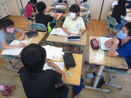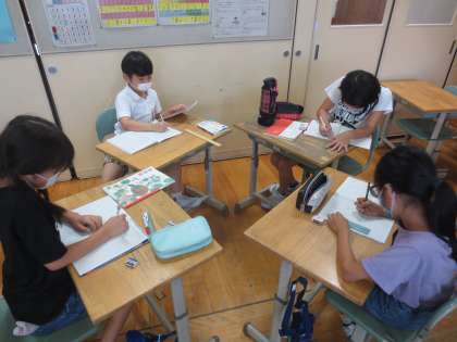 先生新聞を作成するために、取材の準備を進めています。意見を出し合い、次々とノートに書いています。