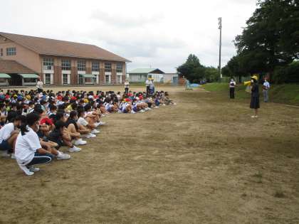 火事を想定した避難訓練が行われました。5、6年生は、教室の外のベランダから、階段つたいにグランドに避難しました。真剣に取り組んでいました。