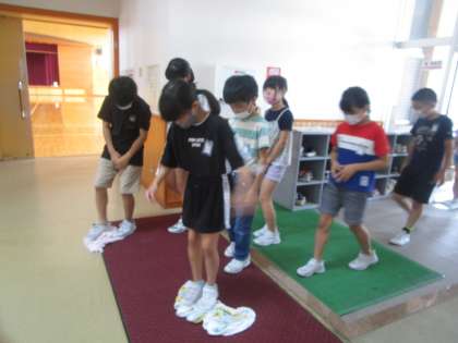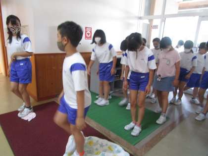 内履きのまま外に出たので、訓練の後は、泥を落として体育館から校舎内に入りました。