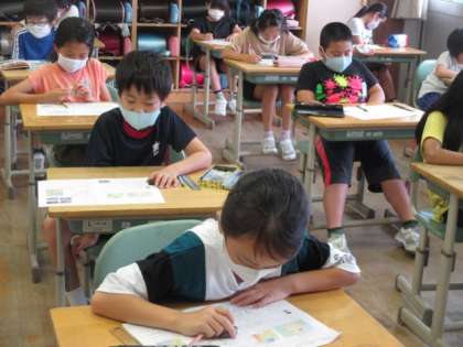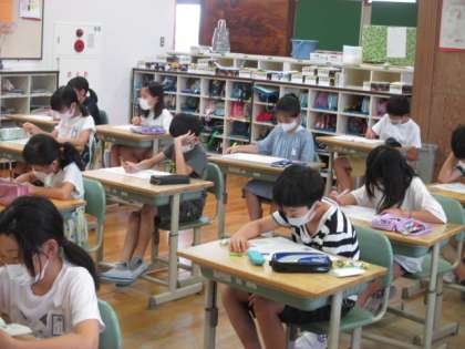 まずは社会です。4年生にもなると問題も難しくなり、時間いっぱい取り組んでいました。