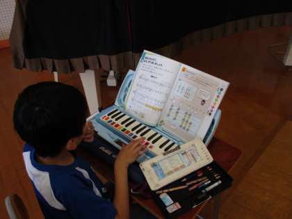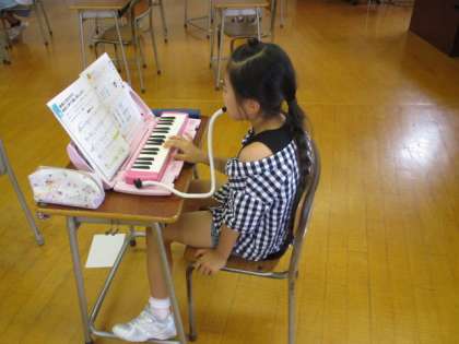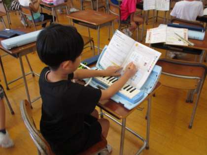 3年生 旋律づくり 公開日 2020/07/22 更新日 2020/07/22 3年生 音楽の学習は、机の間隔を広く開けて行っています。 子どもたちは、自分で選んだ音階を組み合わせて、オリジナルの旋律を作りました。演奏しながら実際の音を確かめ、よりよい旋律にしようと楽しんで取り組みました