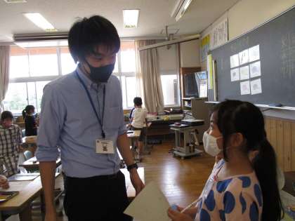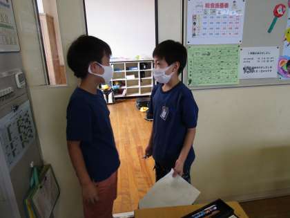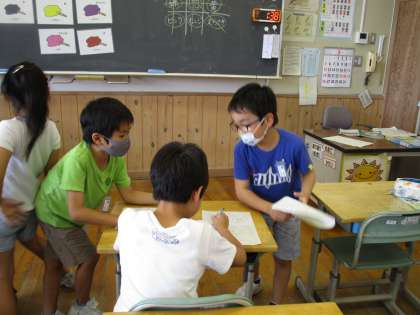 「I like pink.」「I like blue.」 先生や友達と好きな色を英語で伝え合いました。