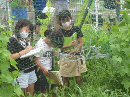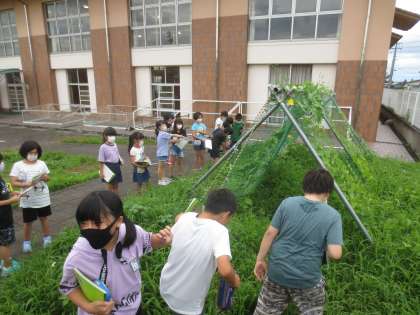 みんなで育てているヘチマの観察を行いました。植え替えたころと比べるとずいぶん大きくなりました。