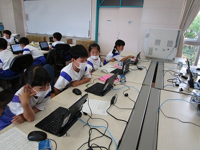 1年生 PC室で学習しました 公開日 2020/07/27 更新日 2020/07/27 1年生 PC室で、生活調査アンケートの回答を行いました。初めての作業に戸惑う様子も見られましたが、近くの友達と声をかけ合って全員入力することができました。