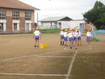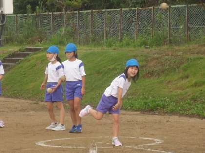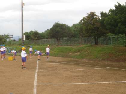 紙鉄砲やお手玉、ジャベリックボールで投げる練習をしてきた子供たち。今日は、投げる力を試してみました。