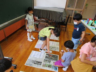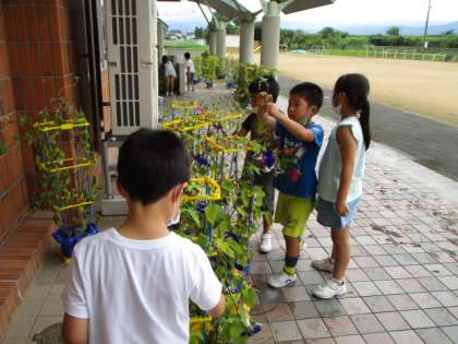 アサガオの種を見付け始めた子供たち。 しぼんだ花で、色水を作って折り染めを楽しみました。