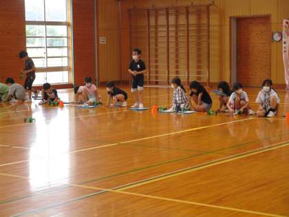 理科の学習では、ゴムの力で走る車を使って狙ったポイントに車を止める活動を行いました。ゴムを引く長さを長くしたり短くしたりして調整し、ピタリと車を止めることができた子供は「やったー」と大きな声で喜んでいました。