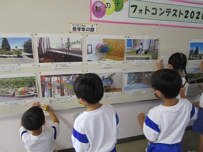 杉の子フォトコンテストの投票を行いました。各学年から選ばれた素敵な写真を、じっくり眺めていた子供たちです。