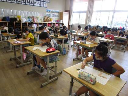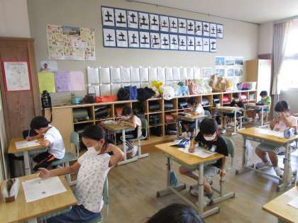 学習のたしかめを行いました。子供たちは、一つ一つの問題に集中して取り組んでいます。