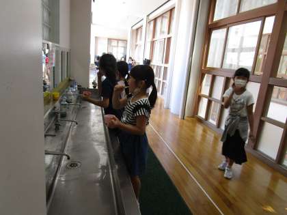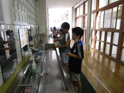「あ〜、すっきりした」 歯磨き後の感想です。 昨日から、給食後の歯磨きを行っています。