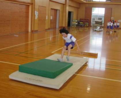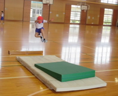 教室で走り幅跳びのコツを動画で確認した後、体育館で実践しました。 どんどんフォームが美しくなっています。