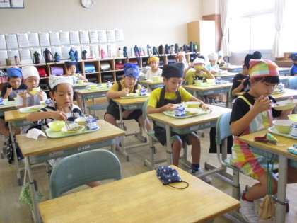 今日から2学期の給食がスタートしました。子供たちは美味しそうに給食を食べています。