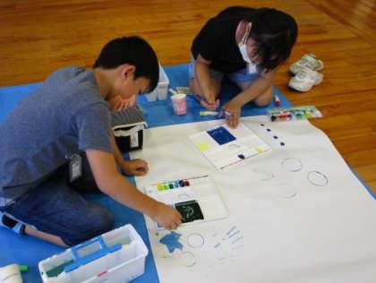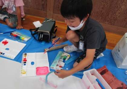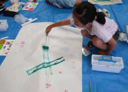 1年生 図工「ぺったんコロコロ」の様子 公開日 2020/08/21 更新日 2020/08/21 1年生 図工で「ぺったんコロコロ」の学習をしました。ローラーを使ってダイナミックに描いたり、持参したカップやクッション材を使ってできる模様を楽しんだりしました。
