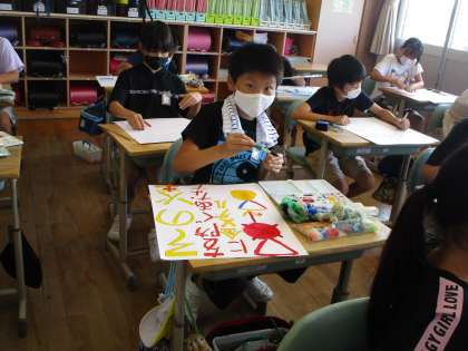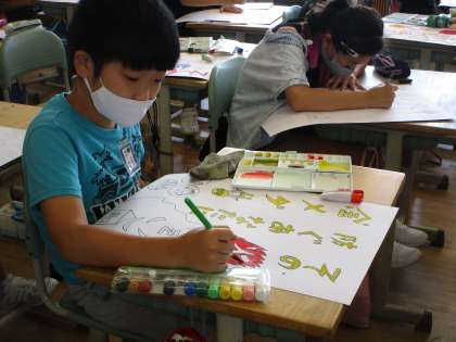 防火ポスターをかいています。「どうしたら、防火について分かりやすくかけるかな」「火のこわさをかきたいな」など、試行錯誤しながら取り組んでいます。