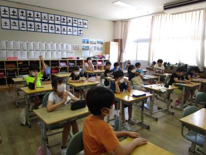 3年生 みんなにクイズ 公開日 2020/08/25 更新日 2020/08/25 3年生 2学期の係活動がスタートし、クイズ係はみんなに問題を出しました。子供たちは悩みながらも楽しんで答えを発表していました。
